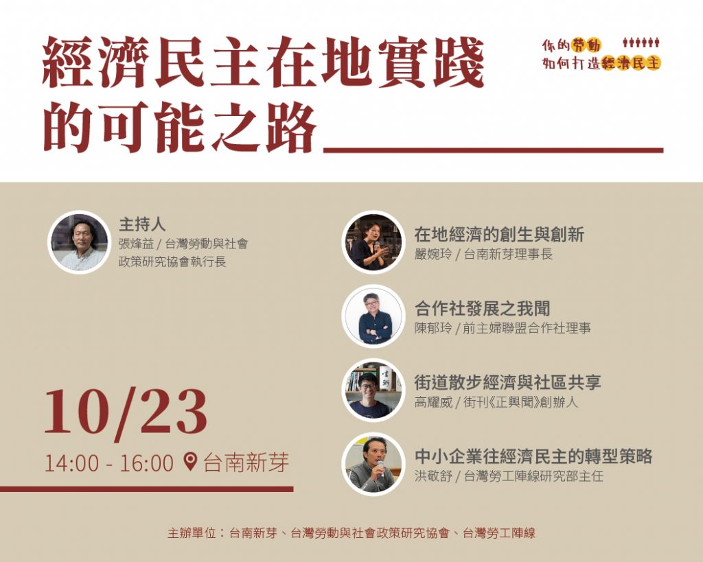 講題及與談人|➤在地經濟的創生與創新 - 嚴婉玲(台南新芽理事長)➤合作社發展之我聞 - 陳郁玲(前主婦聯盟合作社理事)➤街道散步經濟與社區共享 - 高耀威(街刊《正興聞》創辦人)➤中小企業往經濟民主的轉型策略 - 洪敬舒(台灣勞工陣線研究部主任)