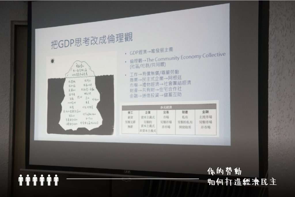 在把「GDP經濟」思維轉換為「倫理觀」思考時,書中提及「支持倫理的市場」的各種方式;對此洪敬舒提到,像台灣民眾針對頂新集團或其他國家進行的「消費者抵制行動」,短期可能快速有所成效,但消費抵制行動也很容易消散,或是遇到一家企業改變,但其他依舊;因此另一種出路,是可以集結一群人重新創造微型市場,進行生產、交換、再分配,而每個微型的企業、如何擴大到社區、擴及形成經濟圈,但過程中還要考慮到地緣、歷史的脈絡,並非單純理想可輕易複製。與第一場讀書會《勞動僱用資本》的概念結合,除了社區共生、共好之外,外部交易購買需求,仍要存在其他民主化的企業,才能形成更好的共同體,而不是獨善其身;我們可以決定經濟不只少數人的遊戲,也能決定市場如何能為所有人服務。
