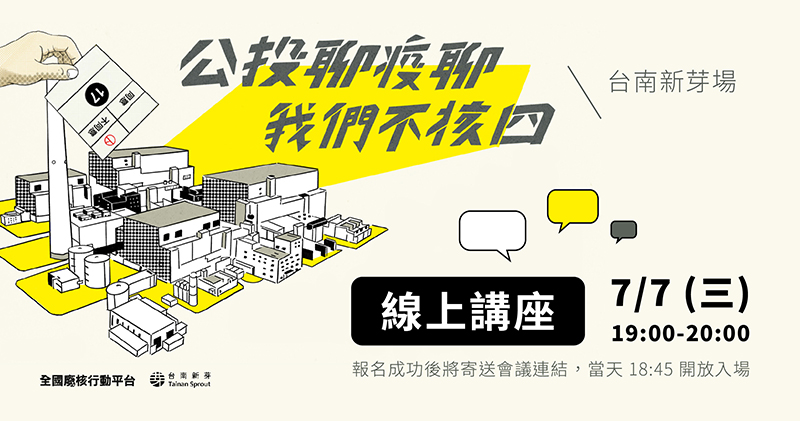 疫情之外,台灣社會也正面臨許多重大的議題。今年八月底,我們將面臨公投,公民社會的討論無法停下腳步。為了讓大家更瞭解核四與台灣的能源現況,全國廢核行動平台與台南新芽合作舉辦線上講座,邀請大家一起來聊聊!