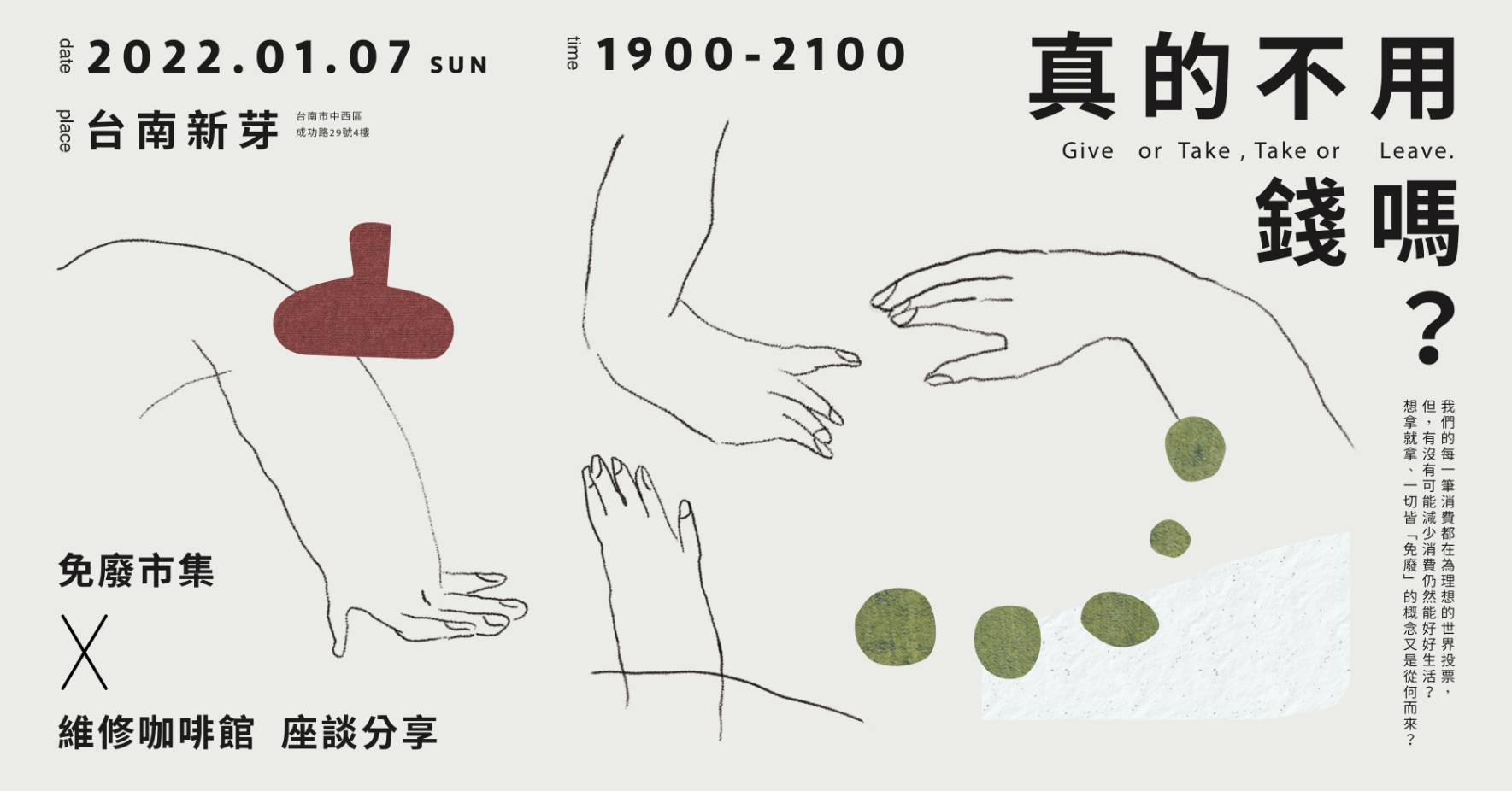 時間:2022年1月7日(五)19:00-21:00(18:30開始入場) 地點: 台南新芽(台南市中西區成功路29號4樓) 主持:吳淨文/台南新芽執行秘書 講者: 或多或少發起人-楊雅妃、張家茵 台南免廢市集聚落-林珊竹 台南維修咖啡館-Vita 活動報名: https://neti.cc/gDBdRAW