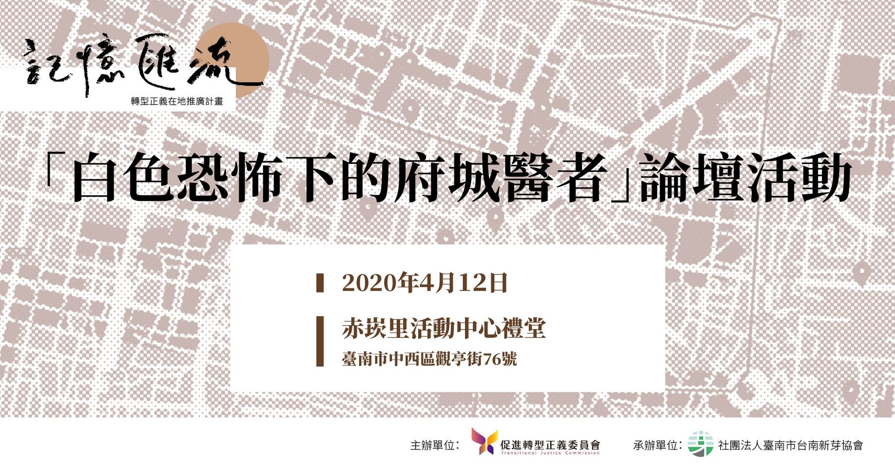 在由促進轉型正義委員會主辦、台南新芽協會承辦之「記憶匯流:轉型正義在地推廣計畫」系列活動中,本次論壇為最後一場活動,將以白色恐怖之下府城醫者作為主要的探討對象,除了梳理相關人物及現有資料、邀集受難者及家屬與會外,也希望更進一步邀請在地民眾一起討論對醫生這個特定職業的政治想像與現實感受。