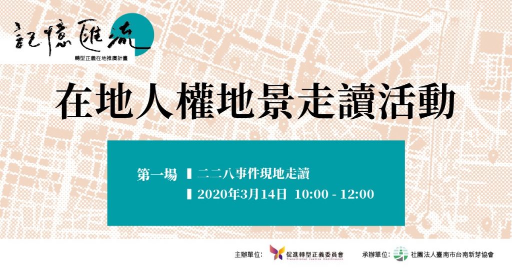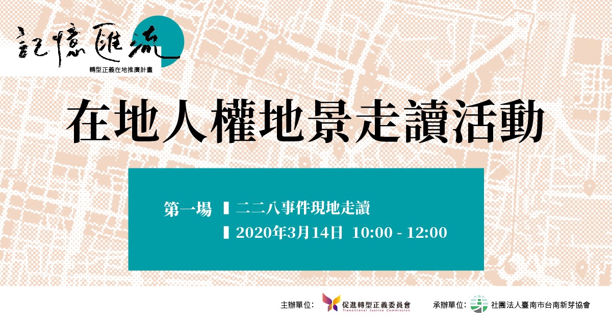 繼2/28、2/29連續兩日的「在地人權地景導覽工作坊」導覽培訓課程之後,即將登場的的是「在地人權地景走讀活動」。而走讀活動將由先前工作坊之成員擔任在地人權地景導覽員,透過走踏現地,帶領參與者重回歷史現場,使歷史事件不只是事過境遷,而能勾起當代人的共感與理解,進一步推廣轉型正義、人權教育等理念,同時累積種子導覽員之導覽經驗。
