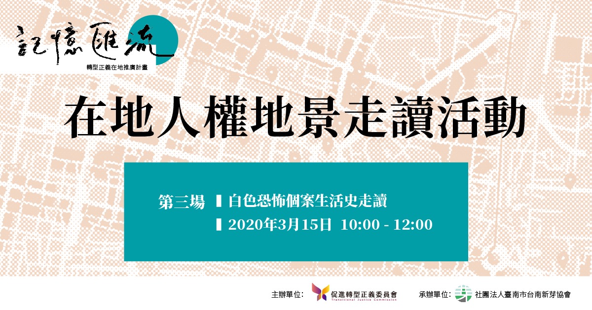 繼2/28、2/29連續兩日的「在地人權地景導覽工作坊」導覽培訓課程之後,即將登場的的是「在地人權地景走讀活動」。而走讀活動將由先前工作坊之成員擔任在地人權地景導覽員,透過走踏現地,帶領參與者重回歷史現場,使歷史事件不只是事過境遷,而能勾起當代人的共感與理解,進一步推廣轉型正義、人權教育等理念,同時累積種子導覽員之導覽經驗。