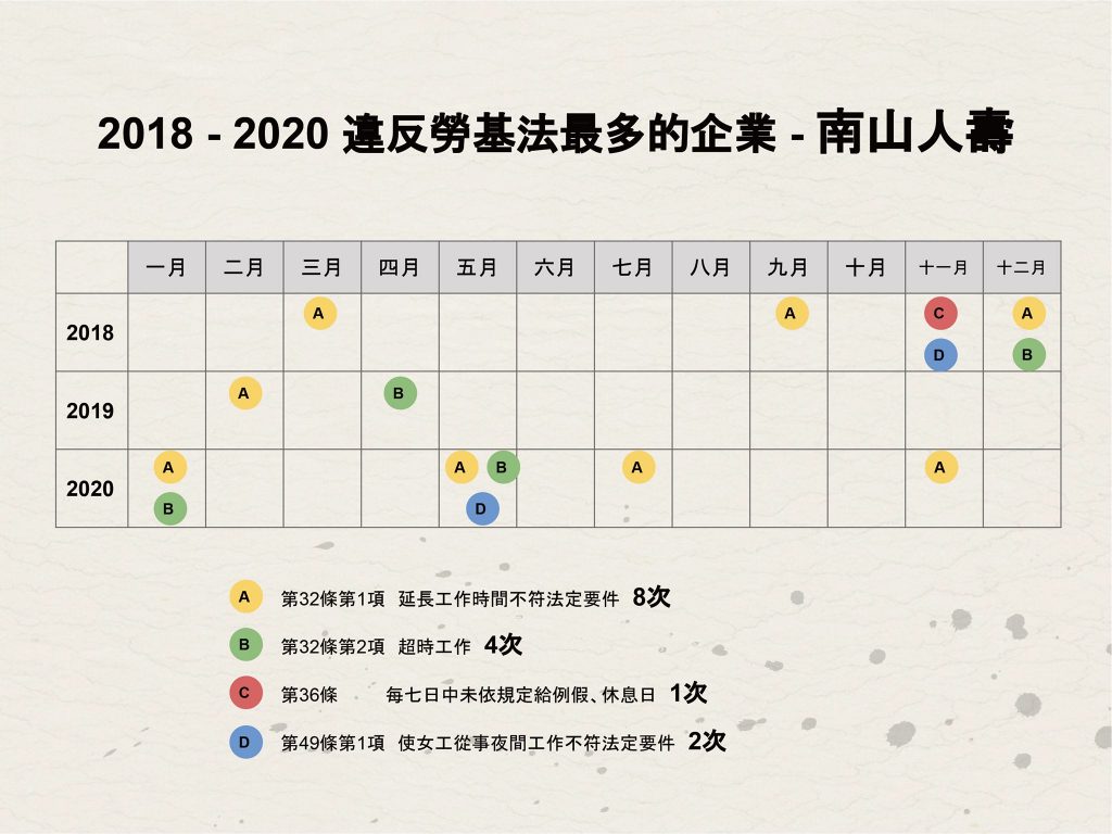 綜觀三年來南市裁罰違反勞基法的企業,以南山人壽違反法條達15項次最多,其中又以32條第1項「延長工作時間不符法定要件」8項次,顯見加班問題嚴重。