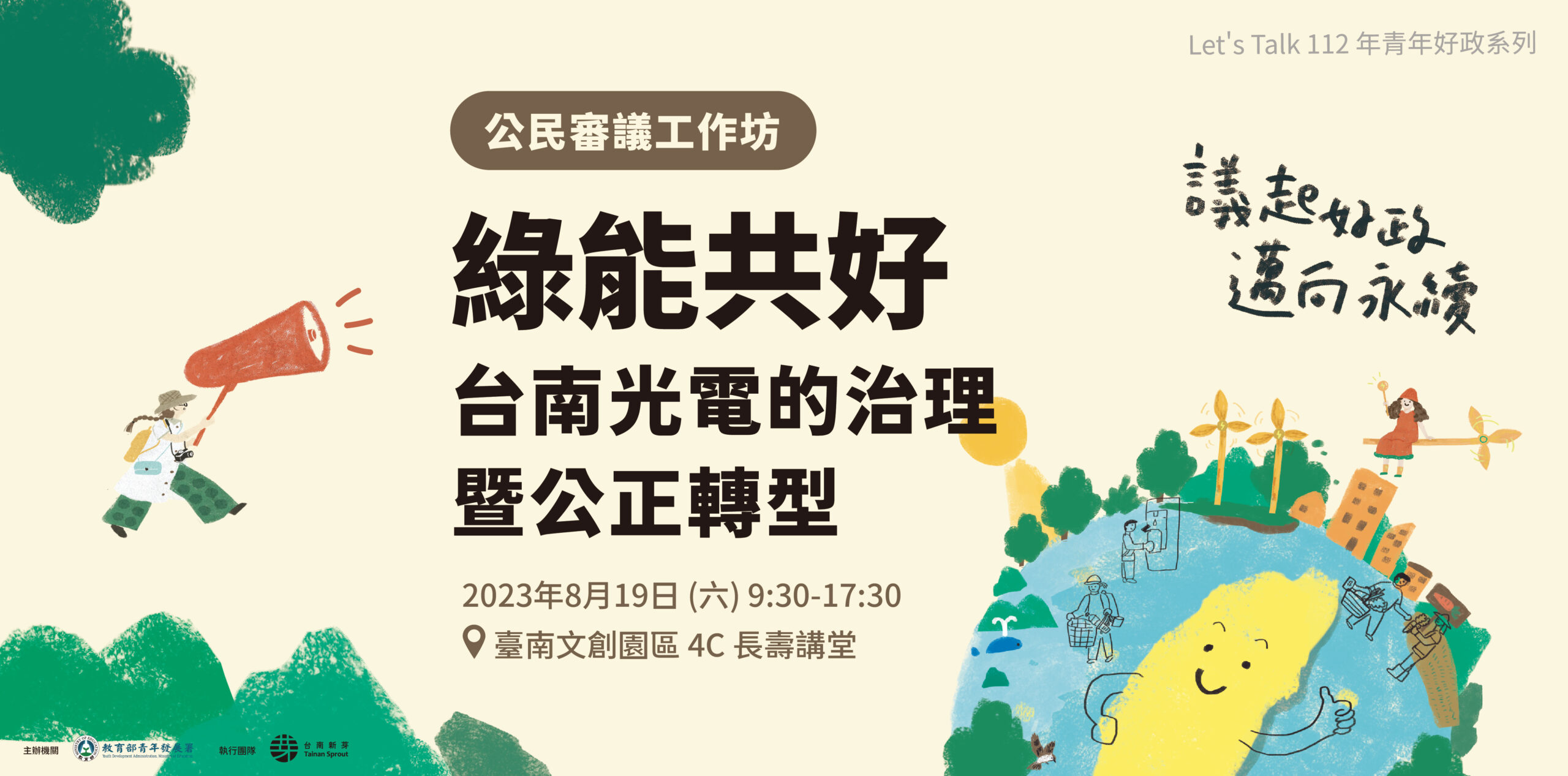 2023 年 9 月 11 日 活動側記|【綠能共好:台南光電的治理暨公正轉型】公民審議工作坊 本次工作坊針對光電開發的監管機制內容讓參與者進行討論,期望讓市府與議會可以作為《臺南市淨零永續城市管理自治條例》立法草擬參考。 admin 0 comments