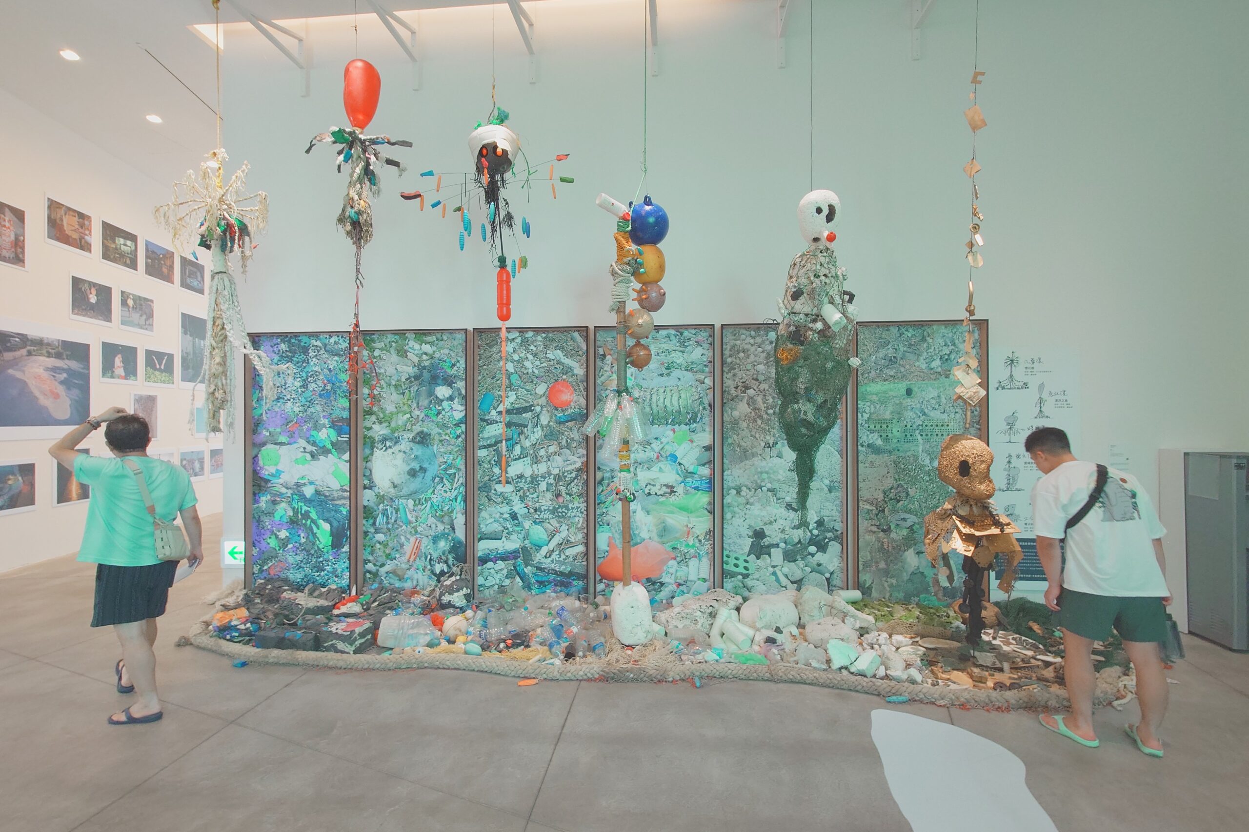 我們從河而來展覽,台南社大研究員晁瑞光〈人的生活進行式〉以海廢作為創作素材,使用六條台南河川中各異的廢棄物,創造出造型人物。(宋小海攝)