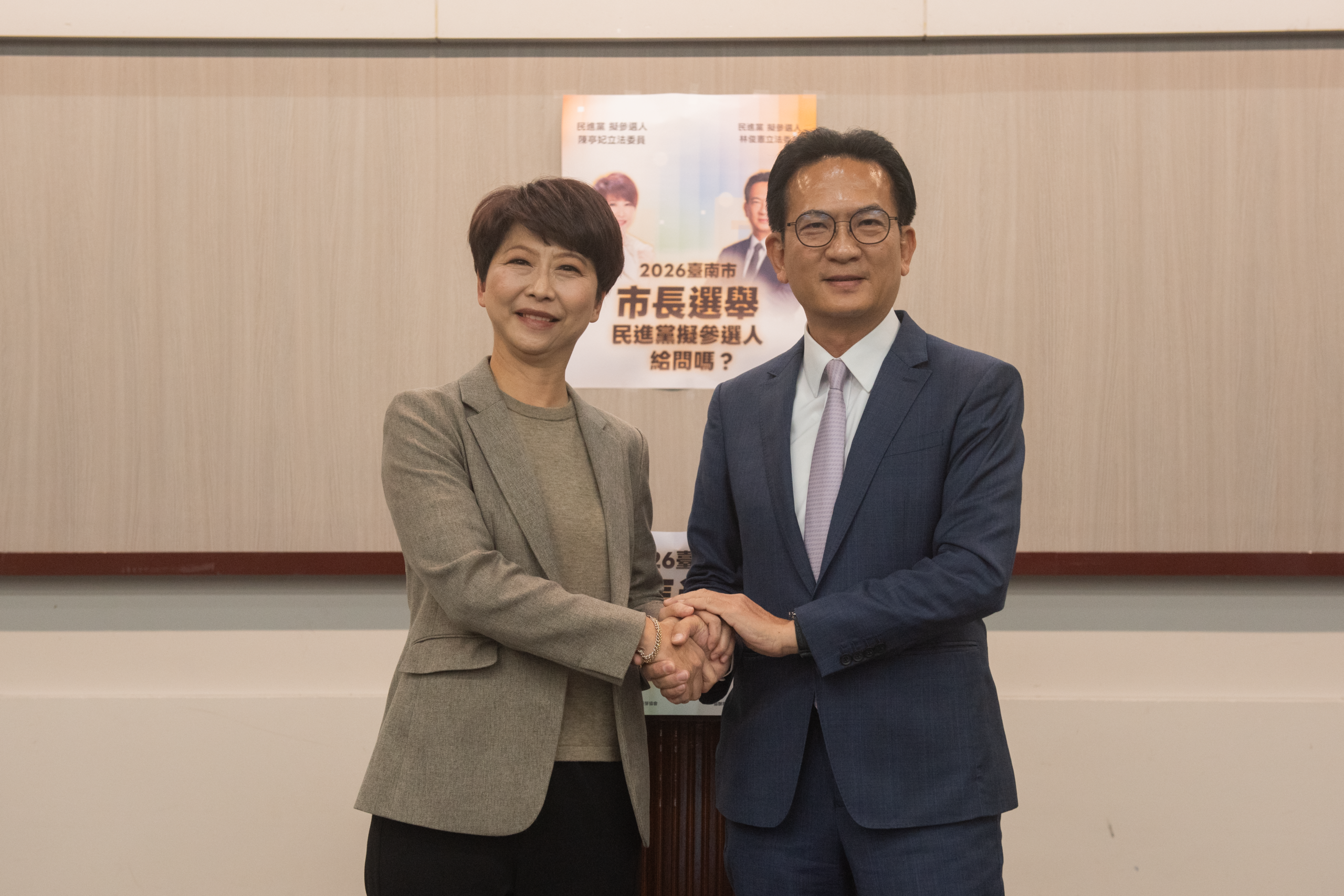 民進黨初選階段給問參與者。 2025年12月29日針對 2026 市長大選提前舉辦初選給問,邀請民進黨兩位擬參選人陳亭妃與林俊憲出席,雙方皆全程參與三階段對話