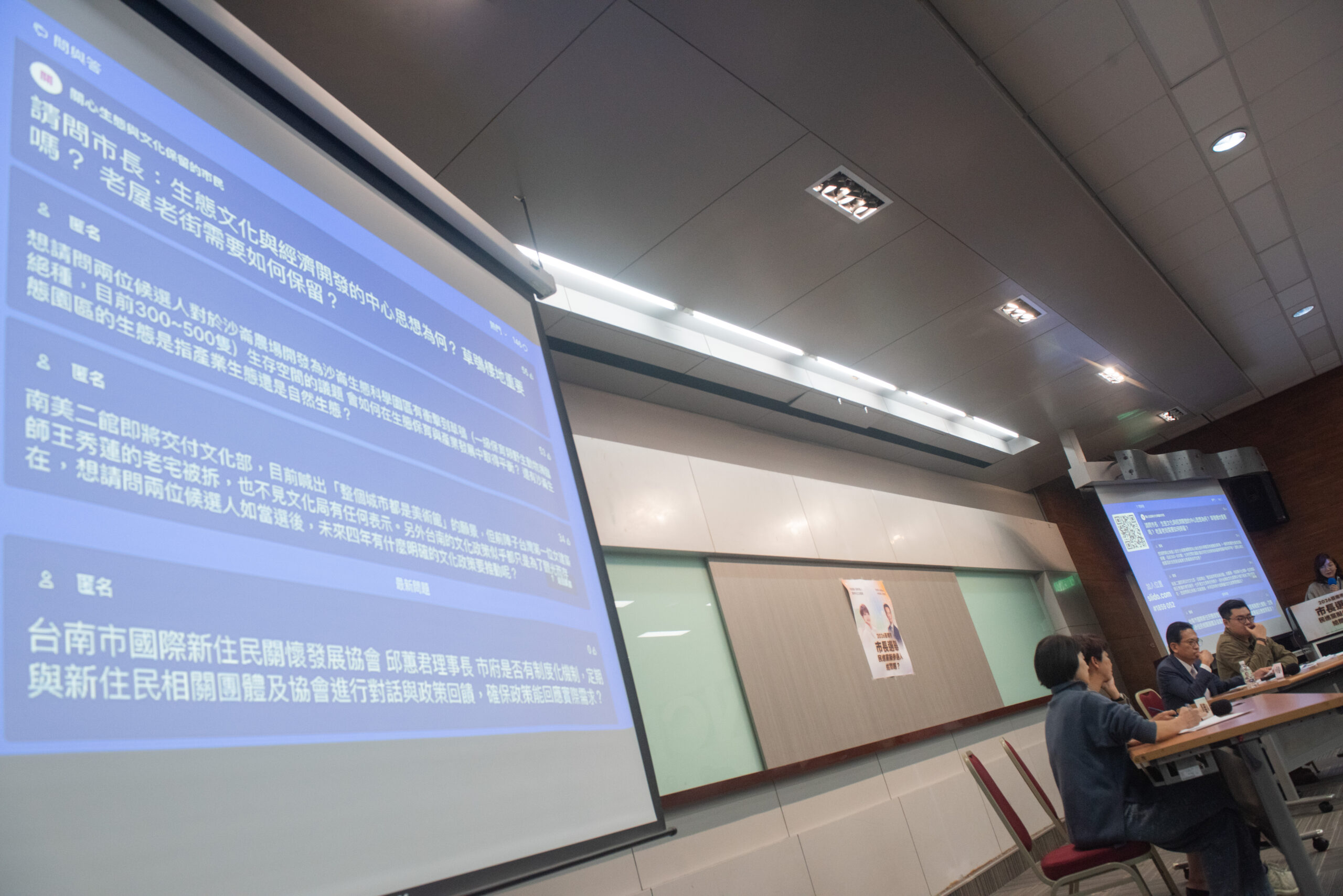 現場流程設計讓每位候選人需接受 30 分鐘的提問,內容包含網站百人連署提問、現場民眾隨機抽問以及直播網友提問。當時黃偉哲直接面對大創案,再次重申未涉入關說與收賄,在親職支持系統的建立則要改善現行政策的不足,不與其他縣市拼發錢。高思博抽中婚姻平權問題,表示自己會對「民法維持一夫一妻」的制度投下同意票。許忠信面對網友發問對於韓國瑜提出在旗津設賭場的看法,表示反對在台南或是旗津透過博奕特區發展經濟;特別是在台南有很多可以發展的產業,不需透過賭場賺錢。蘇煥智表示,台南的觀光目前是「不及格」,停車位不足、騎樓整平等諸多問題都尚待解決。